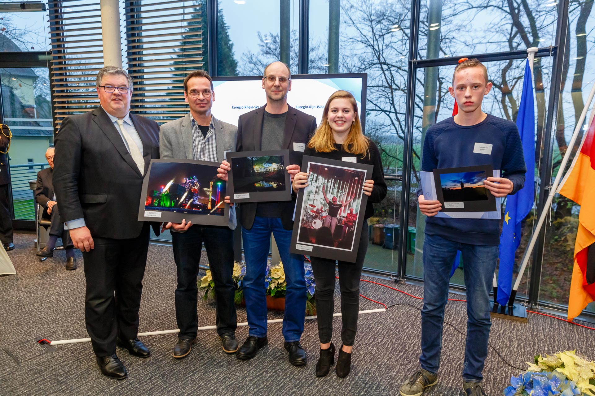 De winnaars van de fotowedstrijd met Euregio-voorzitter Hubert Bruls (midden).