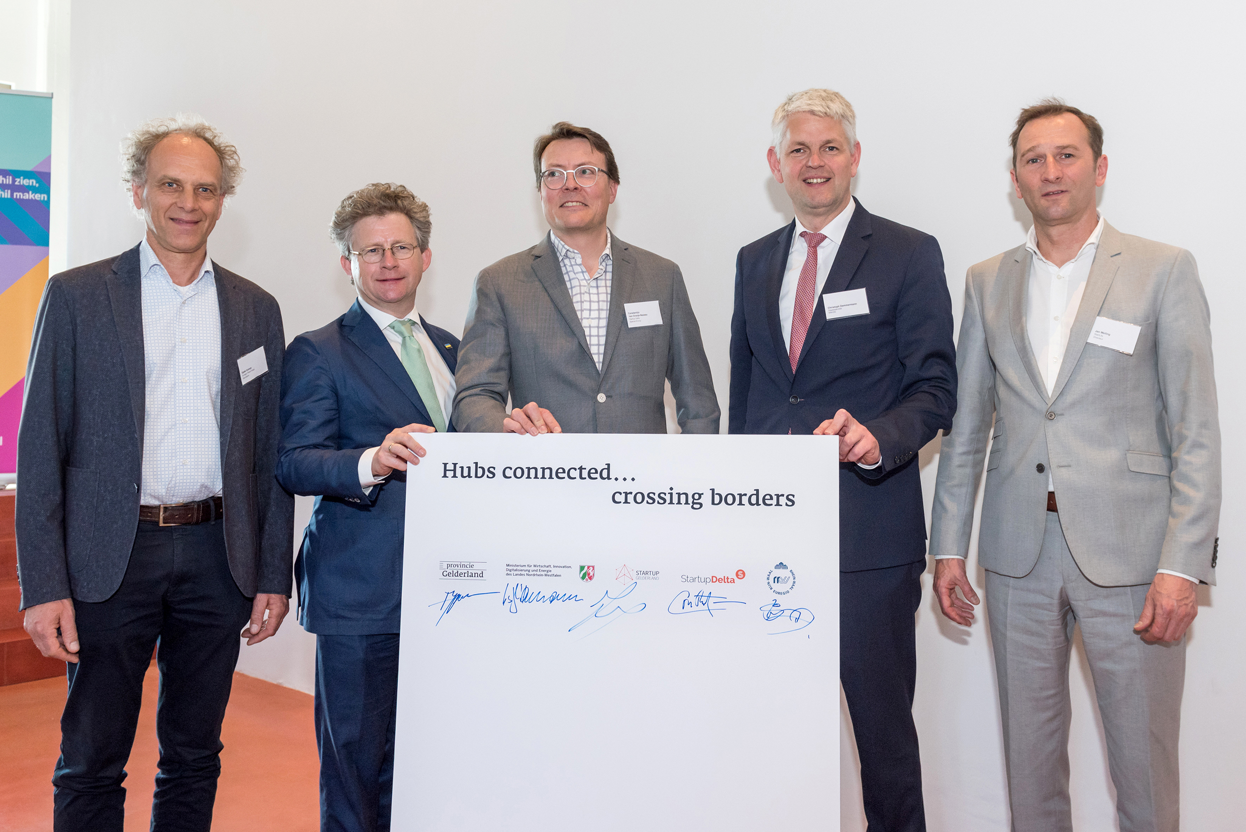 De samenwerking biedt kansen voor startups aan beide kanten van de grens. Gelderland is sterk in agrofood (Wageningen), healthcare (Nijmegen) en energietechnologie (Arnhem). Nordrhein-Westfalen is sterk in ICT en healthcare (Münster) en de innovatieve en creatieve industrie (Düsseldorf). Michiel Scheffer: 'Voor startende ondernemers is het vaak lastig om zaken te doen over de grens. Toch is dat beslist de moeite waard. Met 18 miljoen inwoners is Nordrhein-Westfalen de grootste deelstaat van Duitsland. Andersom biedt Gelderland startups uit Nordrhein-Westfalen toegang tot de Nederlandse markt'. Staatssecretaris van Nordrhein-Westfalen, de heer Dammermann 'In Nordrhein-Westfalen en in Nederland is een levendig Startup ecosysteem. Met het project 'Hubs connected, crossing borders' willen wij de samenwerking tussen de partners in de grensregio versterken. Onze 6 digitale hubs en de partners binnen het Nederlandse ecosysteem zullen in de toekomst nauwer samenwerken om zo synergie te bevorderen bij de ontwikkeling van startups.' Vanuit Nederland tekenden Startup Gelderland (o.a. Health Valley, Briskr, KIEMT, StartLife, Gelderland Valoriseert), vanuit Limburg Brightlands en vanuit Overijssel Novel-t de intentieverklaring.