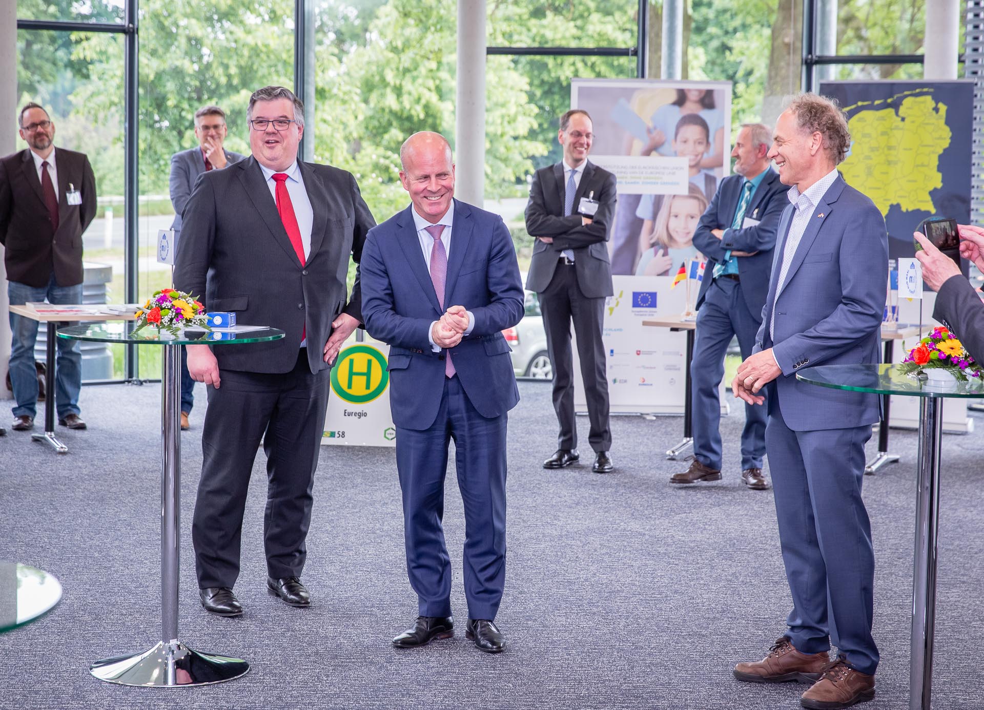 De dag werd afgesloten met een bezoek aan het secretariaat van de Euregio Rijn-Waal. Hier maakte de staatssecretaris kennis met diverse grensoverschrijdende initiatieven rondom de thema´s arbeidsmarkt, veiligheid en zorg, onderwijs, mobiliteit en INTERREG Deutschland-Nederland. De staatssecretaris gaf na afloop van het bezoek aan zeer onder de indruk te zijn van het grote enthousiasme en commitment in de Euregio Rijn-Waal en graag te delen “in de verantwoordelijkheid om de grensregio elke dag een beetje beter te maken”. Euregio-Voorzitter Hubert Bruls is blij met deze steun uit Den Haag: “Het is fijn, dat wij met de staatssecretaris Knops een betrokken aanspreekpartner in Den Haag hebben, die open staat voor de wensen en noden in de grensregio”. De heer Bruls hoopt dan ook dat deze betrokkenheid ook tot praktische ondersteuning leidt voor de vele goede initiatieven in de Euregio Rijn-Waal: “Wij in de grensregio moeten het natuurlijk zelf doen, maar begrip en ondersteuning vanuit Den Haag, maar ook vanuit Düsseldorf en Berlijn maken het wel makkelijker om problemen aan te pakken en de regio verder te ontwikkelen. Wij zijn dan ook verheugd, dat wij de staatssecretaris vandaag een goed beeld hebben kunnen geven van de veelzijdigheid van de grensoverschrijdende samenwerking“.