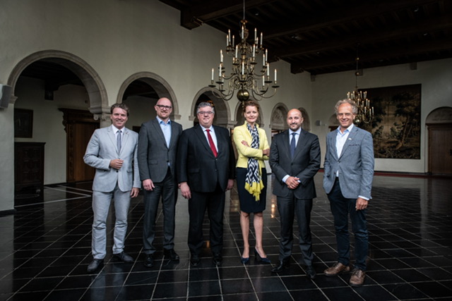 Foto: van links naar rechts: Burgemeister Christoph Fleischhauer (Moers), Oberburgemeister Sören Link (Duisburg), burgemeester Hubert Bruls (Nijmegen), wethouder Hester Veltman-Kamp (Ede), burgemeester Ahmed Marcouch (Arnhem), Sjaak Kamps (secretaris Euregio).