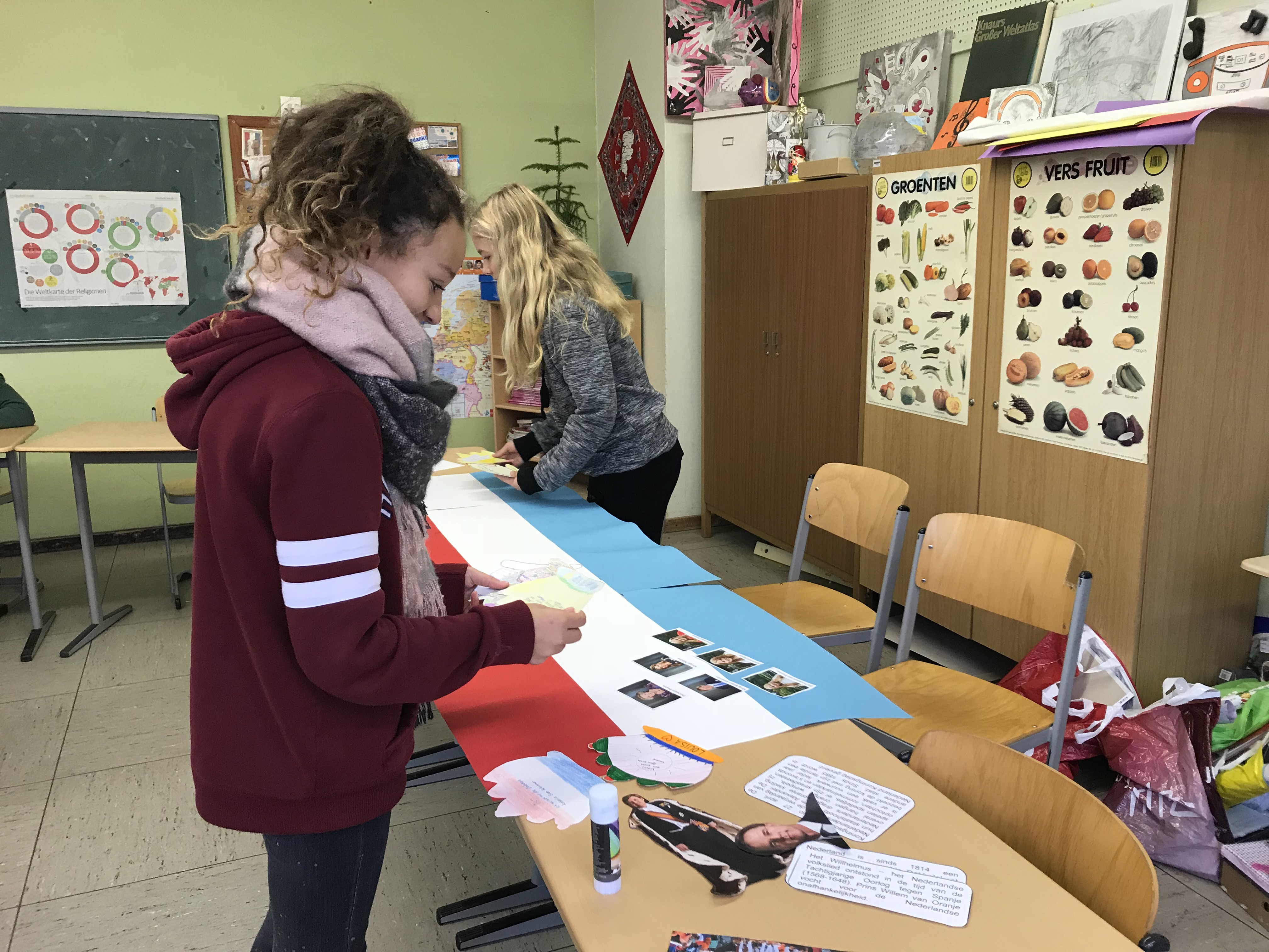 Want over twee dagen moet alles klaar zijn. Deze brugklassers, die allemaal Nederlands leren, doen namelijk mee aan de Nederlands-Duitse Scholenwedstrijd van de Euregio Rijn-Waal. Sinds de klas zich heeft aangemeld, staan in de les de Oranjes centraal. De staatsvorm is duidelijk één van de verschillen tussen Nederland en Duitsland. In teams van drie of vier personen houden de scholieren zich bezig met verschillende thema’s rondom het Nederlandse koningshuis. Daar hoort natuurlijk Koningsdag bij, net zoals de stamboom van Willem-Alexanders familie. Ben stelt enthousiast vast dat de middelste dochter van het koninklijk paar, prinses Alexia, net zo oud is als hij. Het schoolproject wordt steeds interessanter…