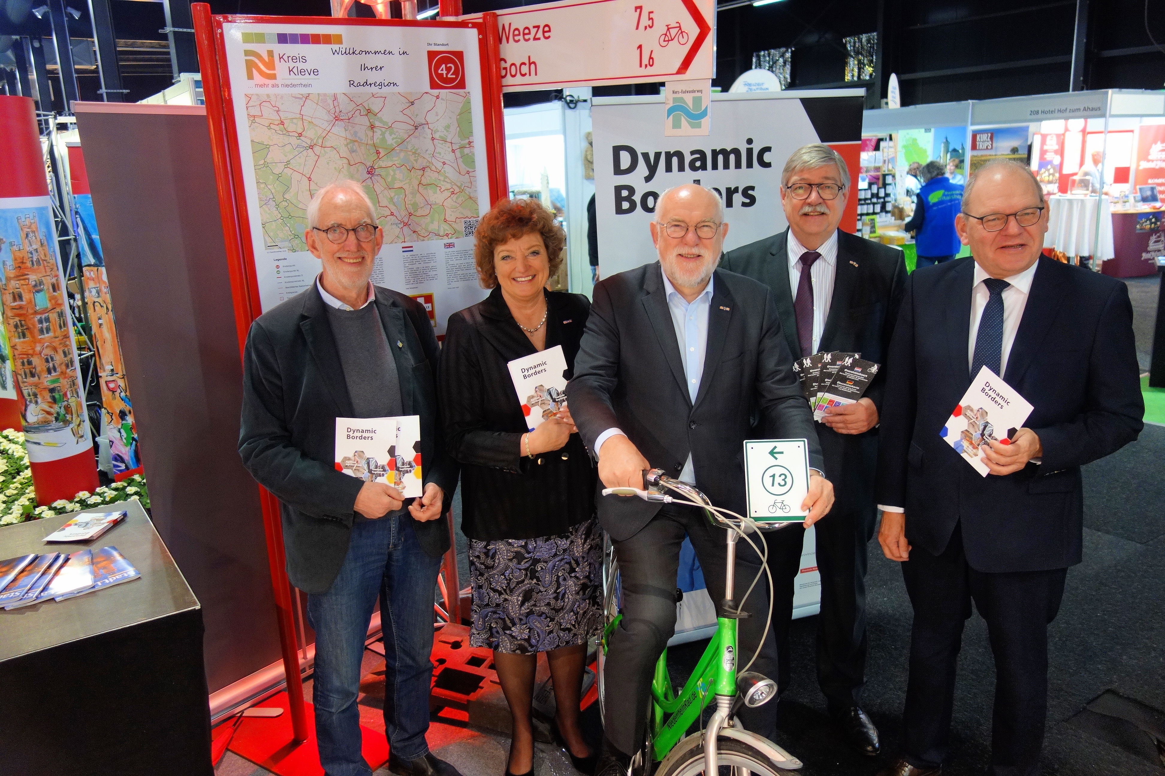 Foto onderschrift (van links naar rechts): Adjunct-burgemeester Rolf Hörster (Weeze), burgemeester Manon Pelzer (Bergen), burgemeester Karel van Soest (Boxmeer), burgemeester Willibrord van Beek (Gennep) en burgemeester Ulrich Knickrehm (Goch), waren positief verrast door de grote belangstelling voor de tien grensoverschrijdende fiets- en wandelroutes.