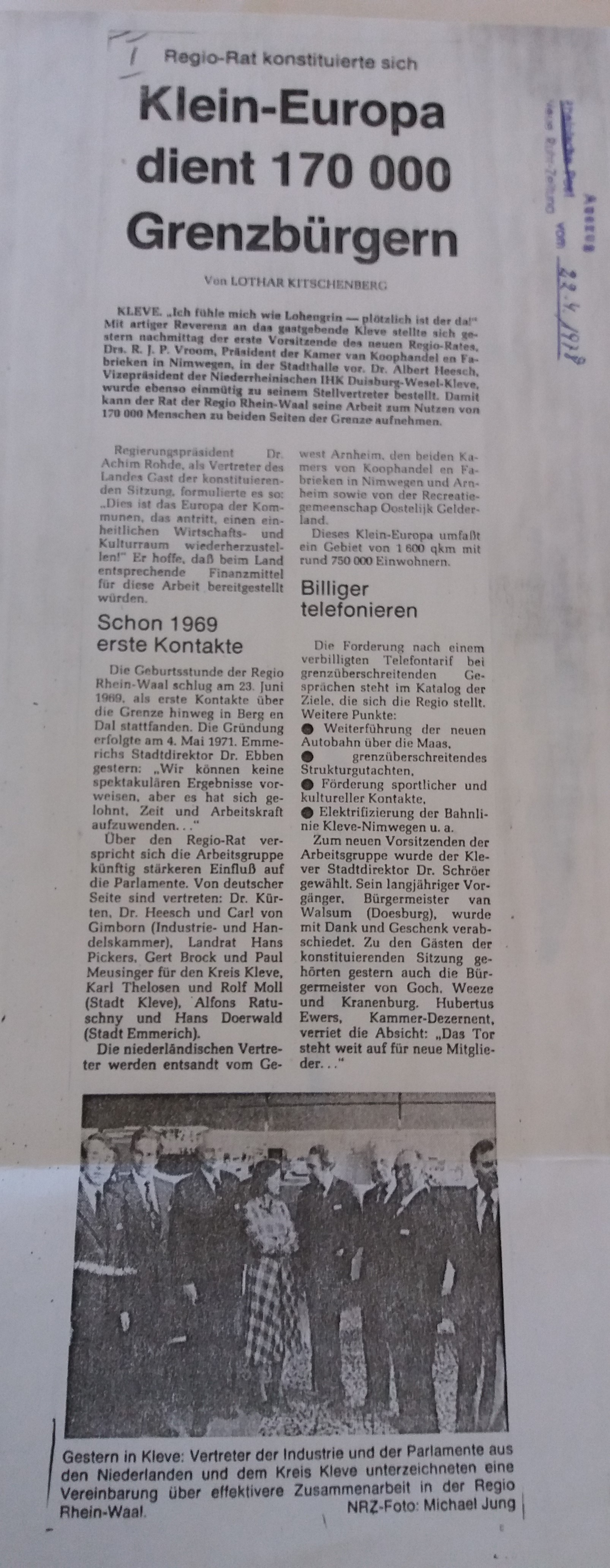 21 april was het precies 43 jaar geleden, dat de Regio Rijn-Waal Raad werd opgericht. De Regio Rijn-Waal Raad was een nieuwe stap in de verdere professionalisering van de Werkgroep Regio Rijn-Waal, die op 4 mei 1971 was opgericht. De Regio Rijn-Waal draagt sinds 1992  de naam Euregio Rijn-Waal.