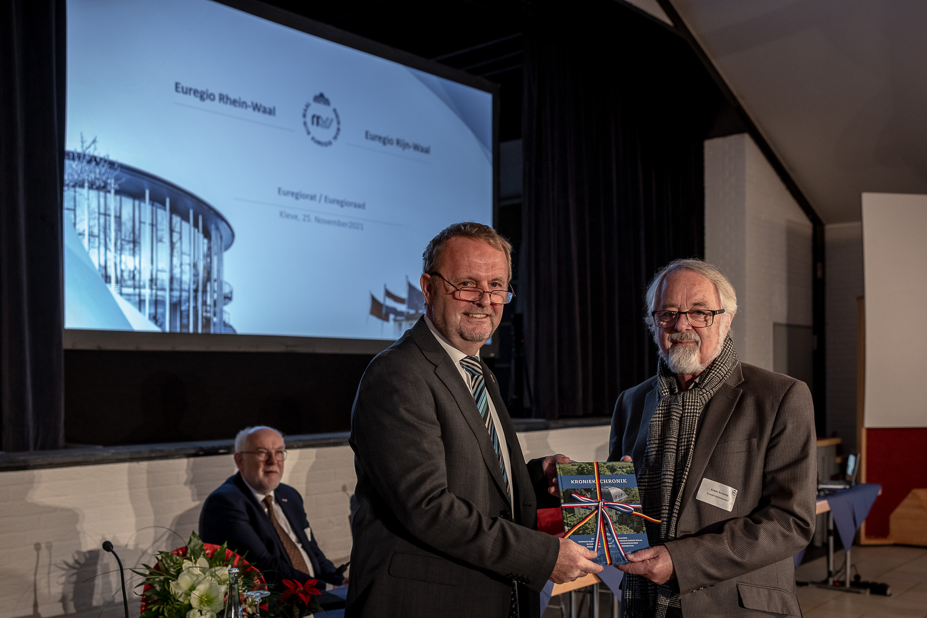 Eigenlijk was het de bedoeling het eerste exemplaar van de kroniek aan Dr. Hans-Peter Martin aan te bieden. Dr. Martin was een van de oprichters van de Euregio Rijn-Waal en was als vertegenwoordiger van de Niederrheinische aanwezig toen op 4 mei 1971 de oprichting van de Euregio Rijn-Waal, toen nog Werkgroep Regio Rijn-Waal, officieel werd voltrokken. Helaas heeft Dr. Martin echter moeten besluiten zijn deelname te annuleren vanwege de huidige Corona-situatie. Zo werd het eerste exemplaar aangeboden aan de heer Erwin Schmitz. De heer Schmitz was niet alleen tot 2009 directeur van de Euregio Rijn-Waal, maar ook daarvoor al zeer betrokken bij de Euregio als gemeentebestuurder van Kranenburg vanaf 1984, en sinds zijn officiële pensionering ondersteunt hij de Euregio als Euregio-ambassadeur. In deze functie is hij al zes jaar geleden begonnen met het inventariseren van de belangrijkste mijlpalen en personen in de geschiedenis van de Euregio Rijn-Waal. Deze inventarisatie werd dit jaar in een gedetailleerde kroniek verwerkt. De heer Schmitz nam het eerste exemplaar in ontvangst, zoals hij het zelf formuleerde, "namens alle mensen die zich al tientallen jaren inzetten voor de Euregio Rijn-Waal en die daarmee de continuïteit en duurzaamheid van haar werk waarborgen". Want zonder de geëngageerde leden, Euregioraadsleden, projectpartners en vrijwilligers zou de Euregio Rijn-Waal zich in de afgelopen 50 jaar niet zo sterk hebben kunnen ontwikkelen, benadrukte ook Euregiovoorzitter Thomas Ahls het belang van een sterk Euregionaal netwerk voor grensoverschrijdende samenwerking.