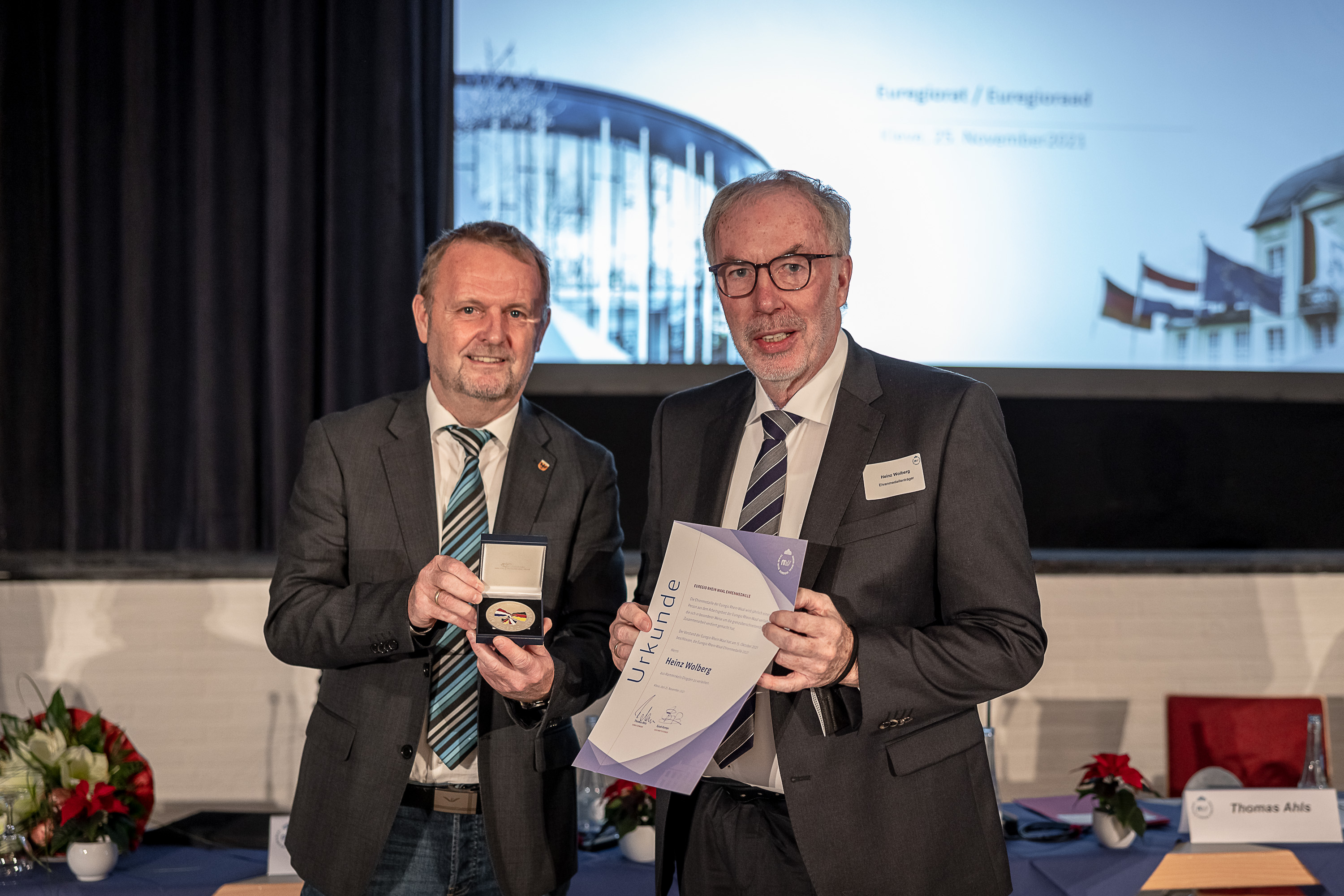 Euregio-voorzitter Thomas Ahls reikte donderdag 25 november tijdens de Euregioraadsvergadering de Euregio Rijn-Waal Eremedaille uit aan de heer Heinz Wolberg, voorzitter van de Heimatverein Dingden en het Humberghaus.