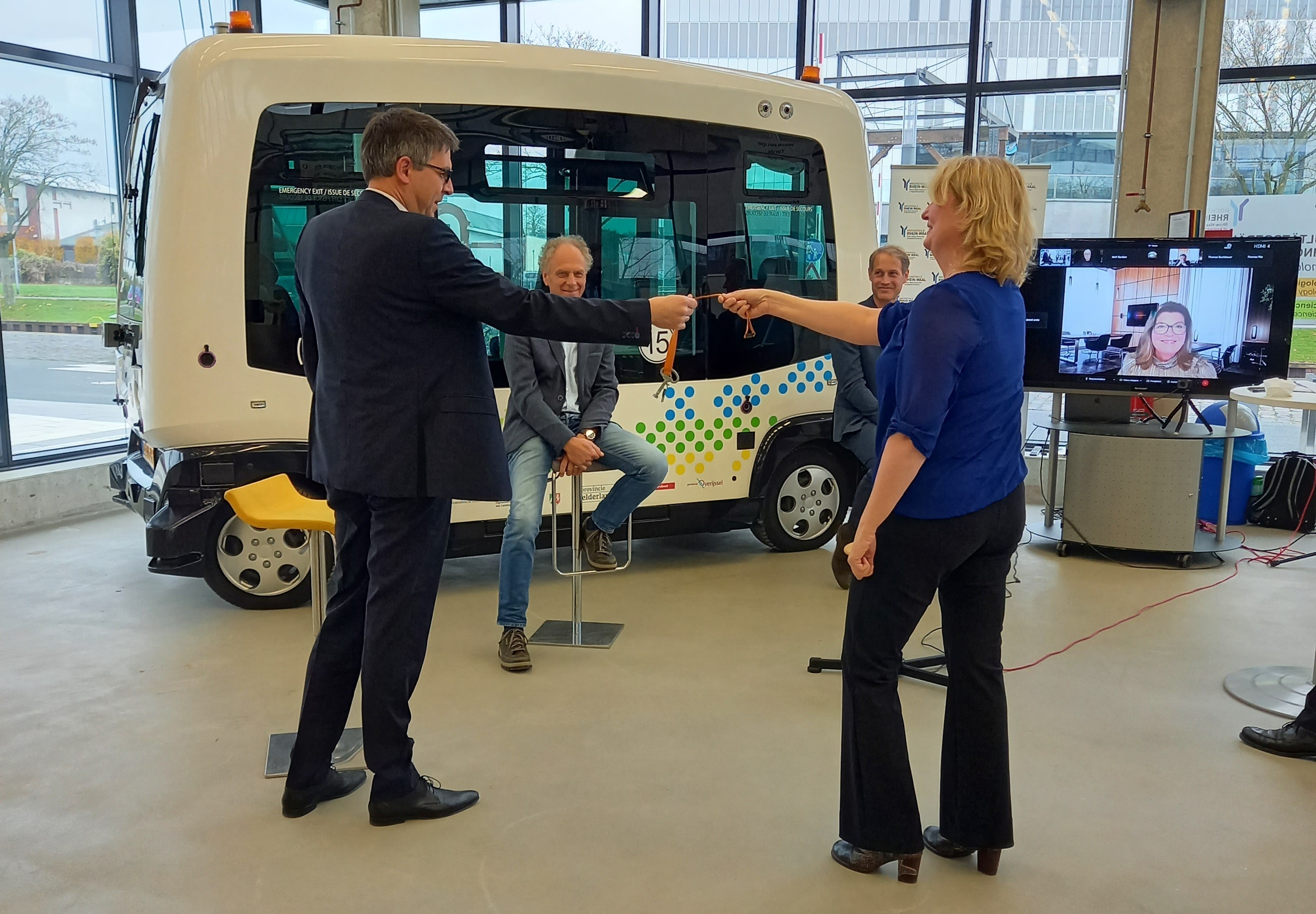 Rector dr. Oliver Locker-Grütjen van de HSRW ontvangt de sleutel van het voertuig uit handen van Herma Harmelink van de Provincie Gelderland. Op de achtergrond: Sjaak Kamps, secretaris van Euregio Rijn-Waal, prof. dr. Jörn Sickmann van de Hochschule Rhein-Waal en op het beeldscherm Christianne van der Wal, gedeputeerde voor mobiliteit van de provincie Gelderland.