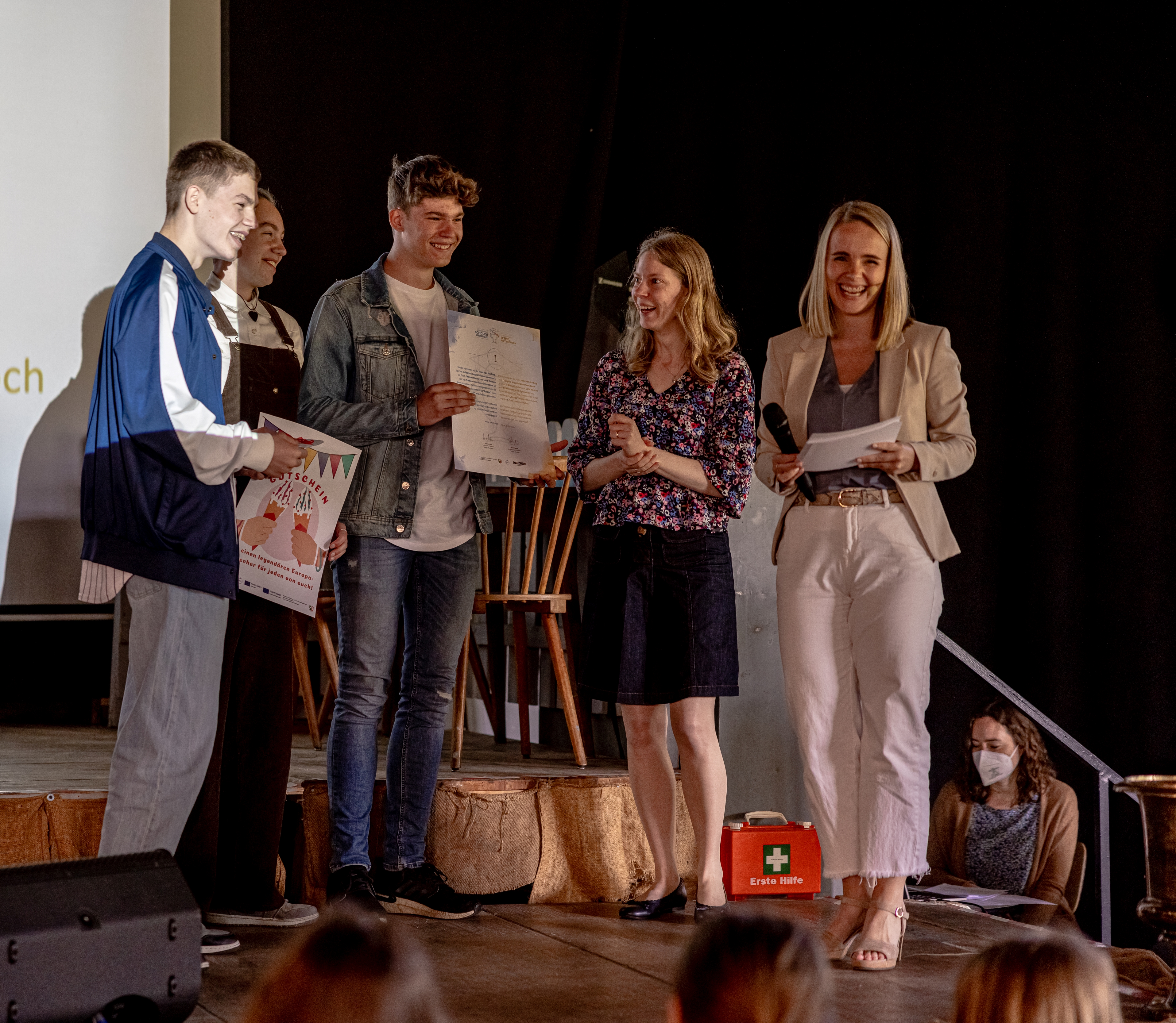 Dat de prijsuitreiking op 9 mei plaatsvond, was geen toeval – want de Dag van Europa paste perfect bij het motto van de Scholenwedstrijd. Ongeveer 400 scholieren uit 19 Nederlandse en Duitse klassen gingen de afgelopen maanden aan de slag met best- en worst-case-scenario’s voor het continent waarop zij leven. Presentatrice Sina Kuipers vertelde de scholieren aan het begin van het evenement hoeveel respect zij daarvoor heeft: “Ik vind het heel dapper hoe jullie je zo in dit moeilijke thema verdiept hebben. Jullie hebben dus wel een applaus verdiend!” Ook de jury was onder de indruk van de inzendingen. “Ik vond het heel interessant om te zien welk beeld de scholieren van Europa hebben, wat hen motiveert, welke angsten en welke hoop ze hebben”, aldus Pia Awater, projectmedewerker Nachbarsprache & Buurcultuur bij de Universität Duisburg-Essen. Ook Euregio-ambassadrice Regina Schneider vond het een mooie ervaring om jurylid te zijn: “Ik heb door de inzendingen veel geleerd.”