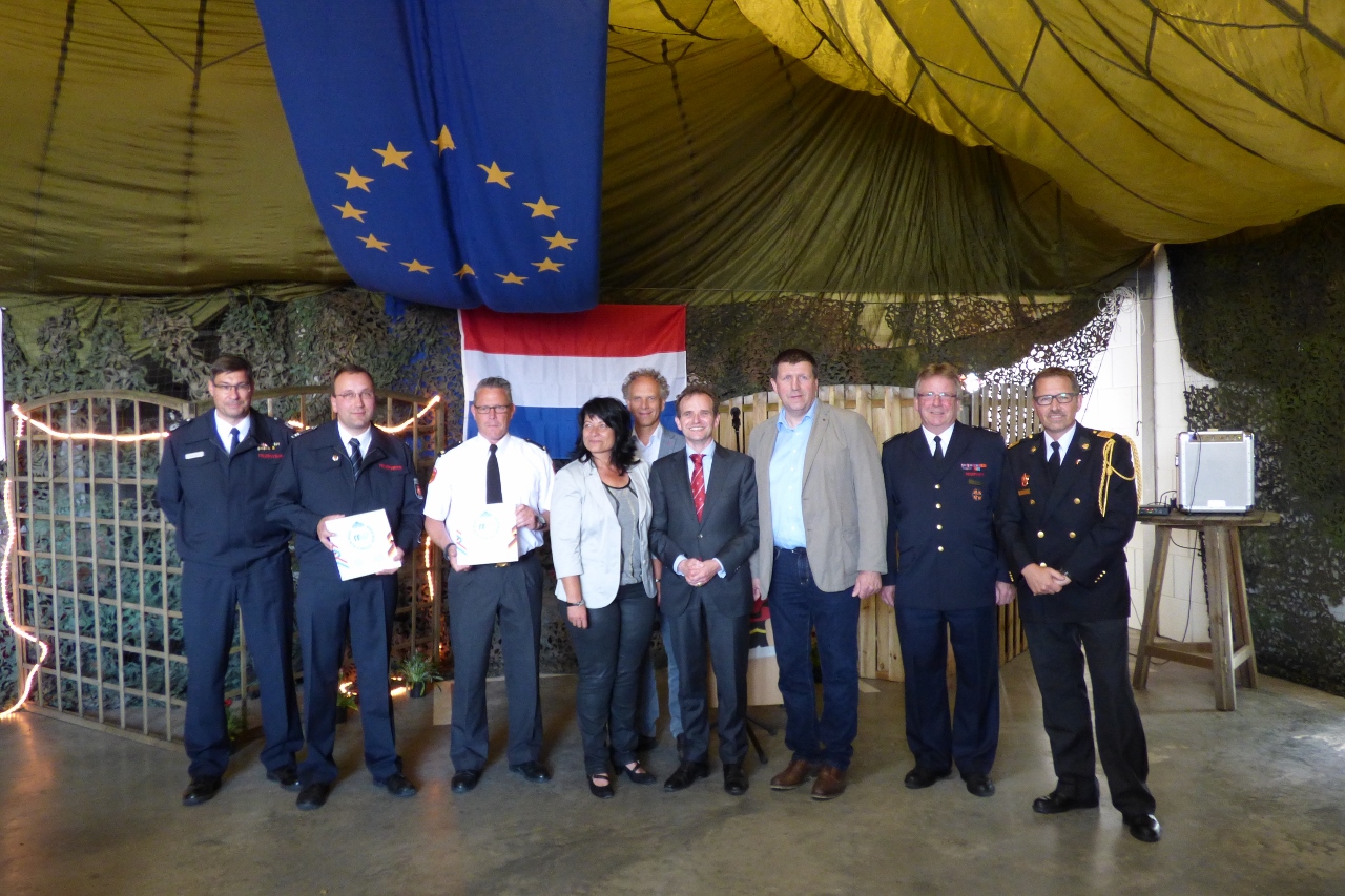 Ulrich Francken, plv. voorzitter van de Euregio Rijn-Waal, overhandigde Peter Heijmen, groepschef van de brandweer Millingen en Daniel Kuhnke, hoofd van de vrijwillige brandweer Kleve-Rindern een Euregio-plaquette als blijk van waardering voor dit geslaagde voorbeeld van grensoverschrijdende samenwerking.