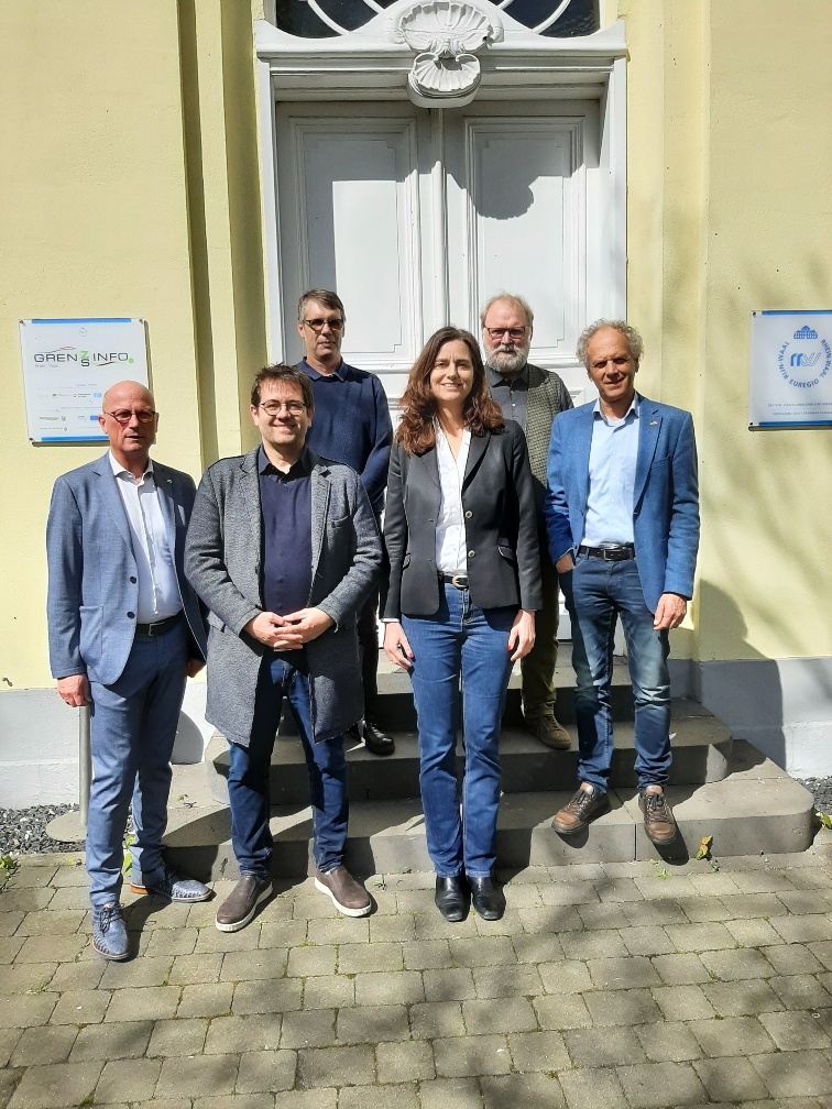 v.l.n.r.: Peter Hinze (Lid Dagelijks Bestuur Euregio Rhein-Waal en burgemeester Emmerich), Christian Bomblat (klimaatmanager bij de Stadt Kleve), Oliver Roth (bestuurslid van de afdeling Kleve van Bündnis90/Die Grünen), Lid van het Europees Parlement Alexandra Geese, Michael Bay (fractie Bündnis90/Die Grünen in de gemeenteraad van Kleve), Sjaak Kamps (Secretais Euregio Rijn-Waal)