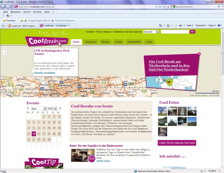 Das Projekt Cool Breaks ist eine gezielte, internationale Marketingkampagne im Tourismusbereich. Auf der Website wird den Besuchern ein Überblick über interessante Ziele und Übernachtungsmöglichkeiten in den Südostniederlanden und am deutschen Niederrhein geboten. Durch den Einsatz von (Web-) Marketing 2.0 werden Besucherprofile erstellt und gespeichert. Mit diesen Daten entwickeln die Projektpartner marktspezifische Produkte, beispielsweise grenzüberschreitende Arrangements, die wiederum auf der Website angeboten werden. Dadurch wird das Interesse von Besuchern aus beiden Ländern an einem Besuch im Nachbarland angeregt.